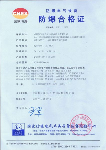 L-CNG增压气化装置防爆合格证